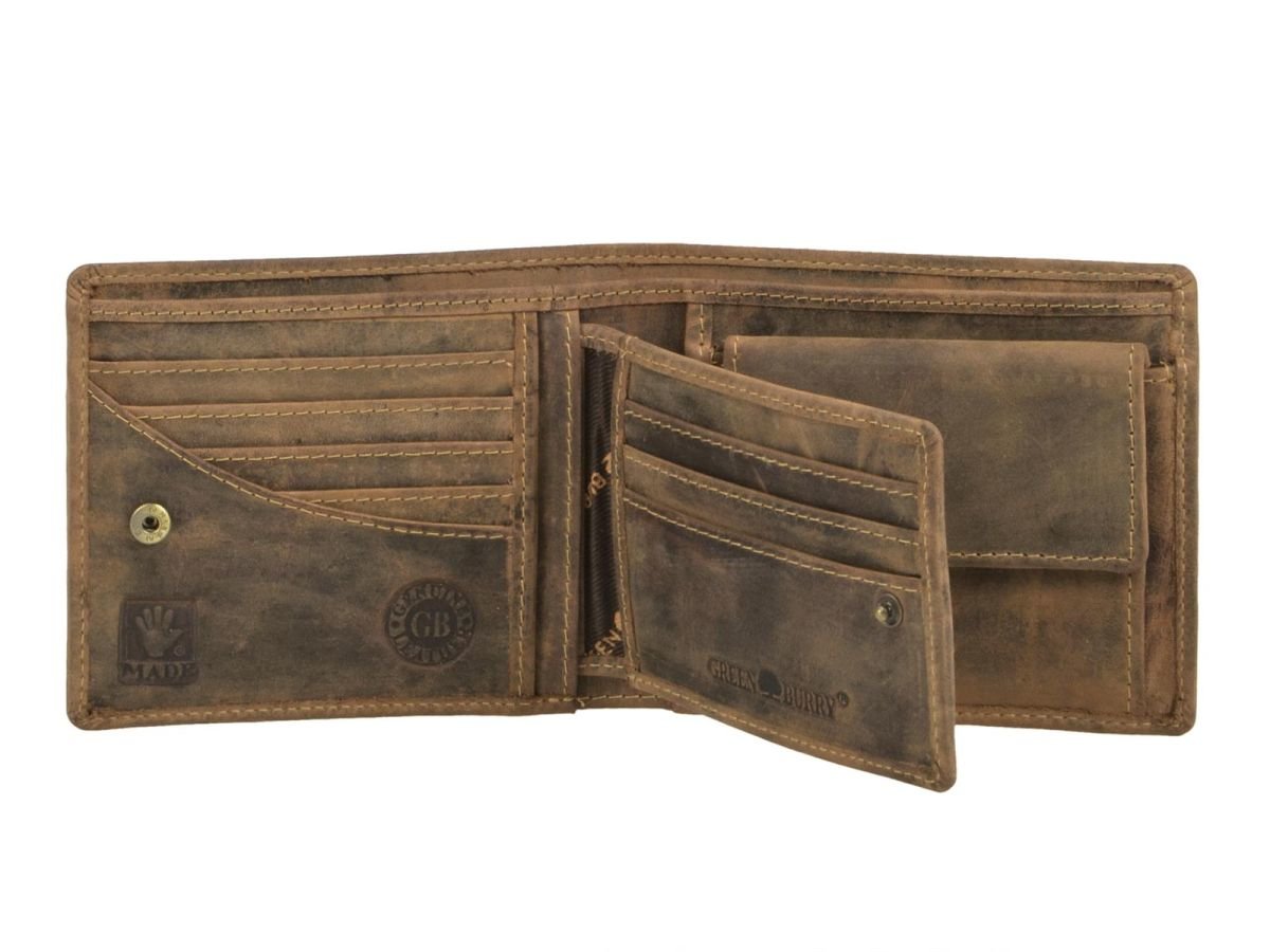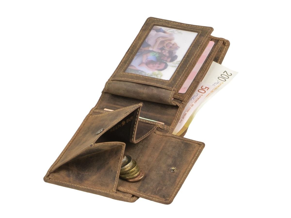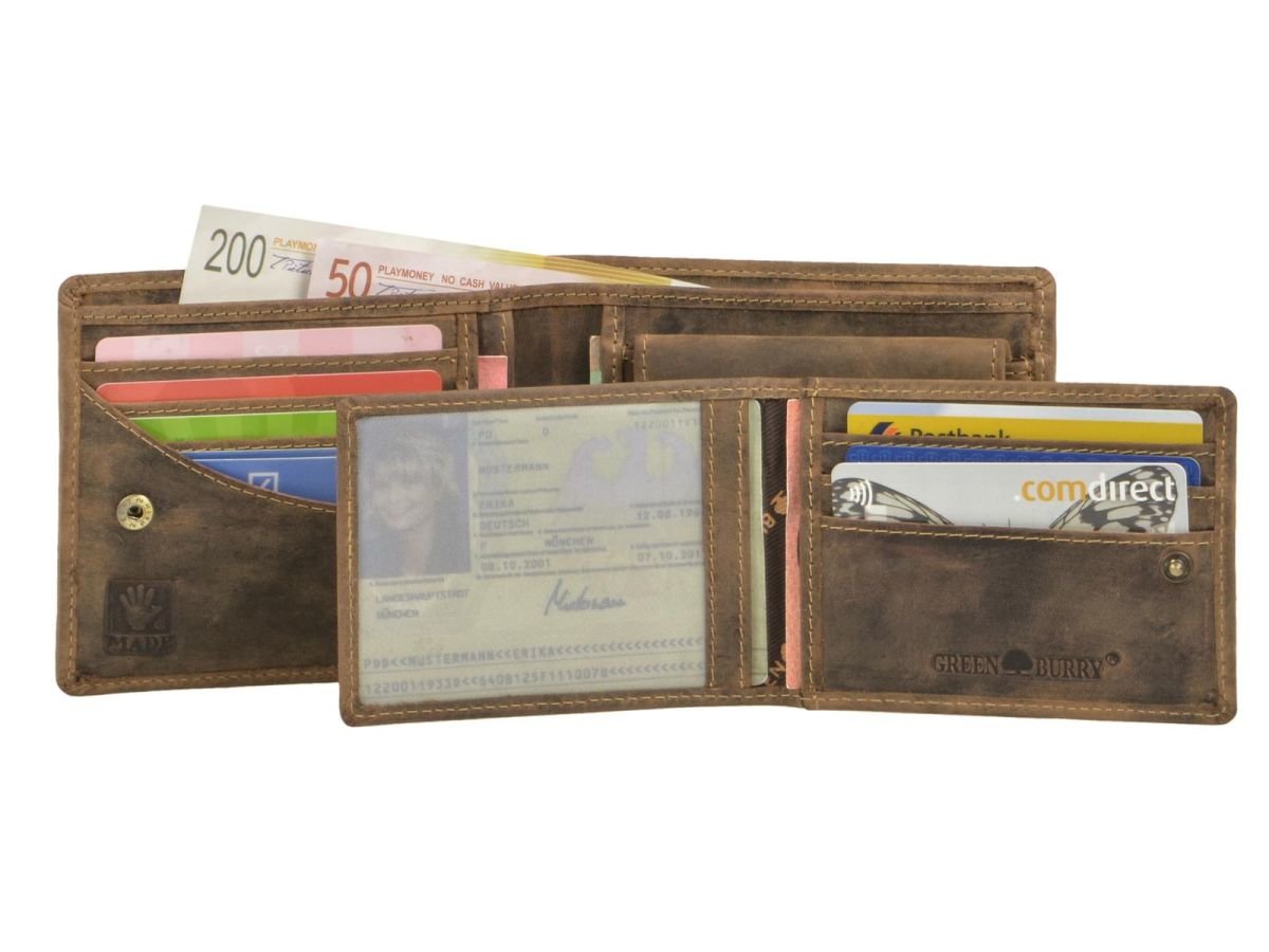 - herausnehmbares Ausweisabteil mit 3 Kartenfächern, 1 Einsteckfach und 2 Sichtfenster